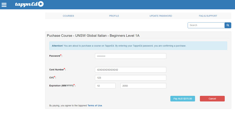 The TappnEd platform also provides Learners with further security. To confirm that the person purchasing the course under the Learners' account, TappnEd requires that the Learner is required to enter their TappnEd login password as well as the Learners' Credit Card details.
