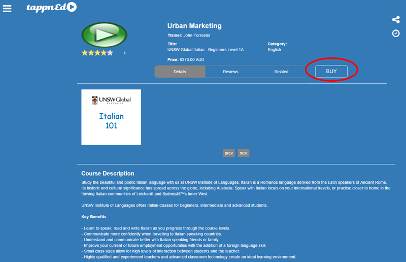When a Learner has decided to participate in a course and the course is a paid course the Learner is required to click on the "Buy" button.