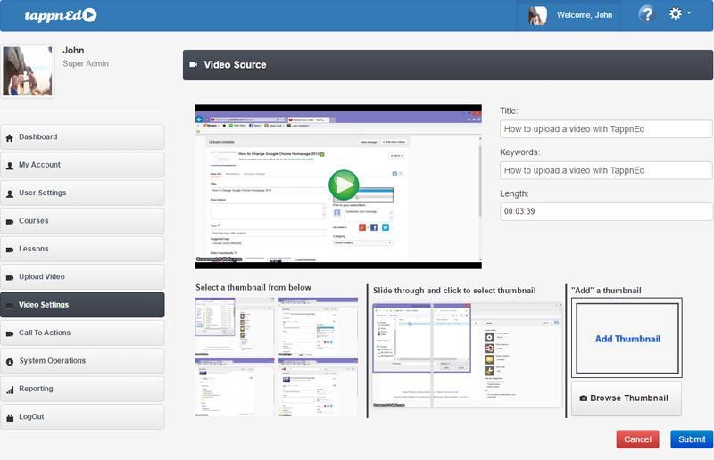 To replace and/or update the video's thumbnail, the Educator clicks on the blue "Edit" link next to the thumbnail. The Educator will then be allowed to either chose another thumbnail by sliding through the video frames or by uploading a thumbnail from their PC's