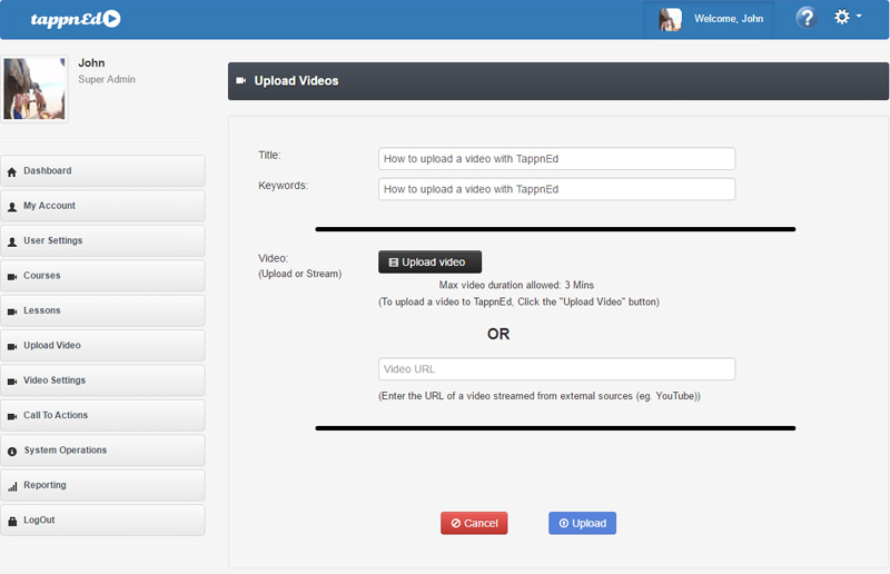 To replace and/or update the video and keep the relevent information, the Educator clicks on the "Update Video" button and the "Upload Video" page will be displayed. You will notice that the Title and Keywords have not been changed.