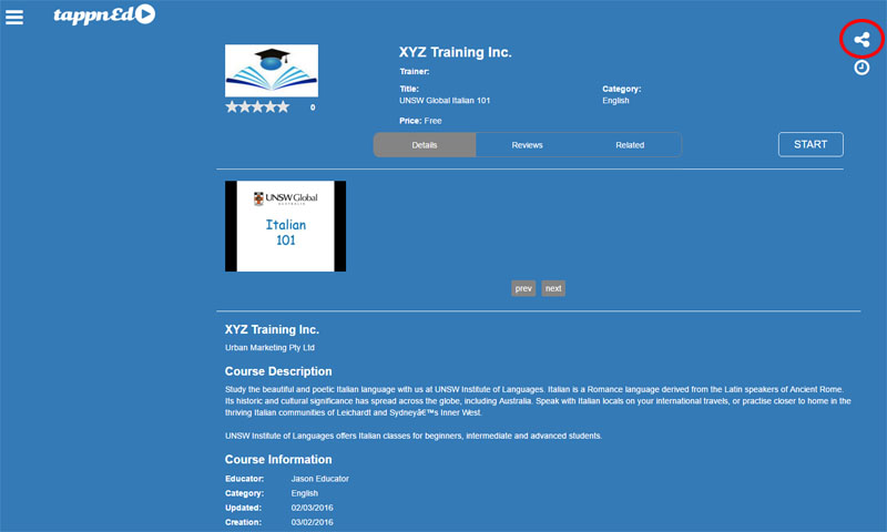 Learners are able to share courses to thier friends or connections by clicking on the "Share" icon from the Course Holding page.