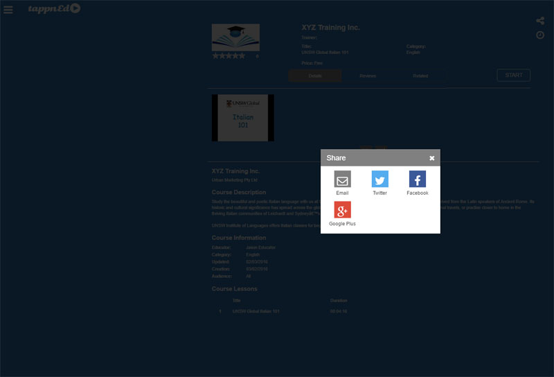 When a Learner clicks on the "Share" icon on the the Holding page, TappnEd will allow the Learner to share the course via the following Social Media platforms: