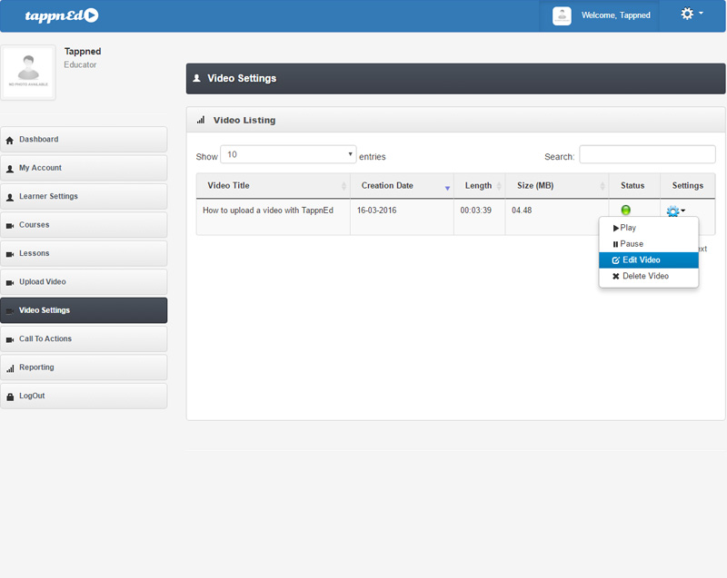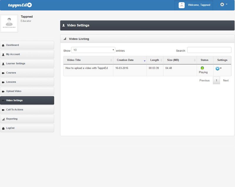 Once an Educator has successfully uploaded a video to be used with a Lesson, the video will be added to the "Video Listing" table in the Video Setting page.